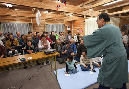 東北地方でのスライドと講演を終え帰阪しました。 2011年10月24日から11月6日まで主に福島原発事故のため、半径20km圏内に住む人々が避難去れている、仮設状宅(楢葉町、富岡町、広野町)で3日間にわたり6カ所を「笑いの療法士」赤川浄友僧侶とご一緒に回り、