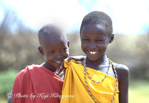 はにかみながら仲間の肩に隠れる少年。マサイの子どもたちは恥ずかしがりやだ。
